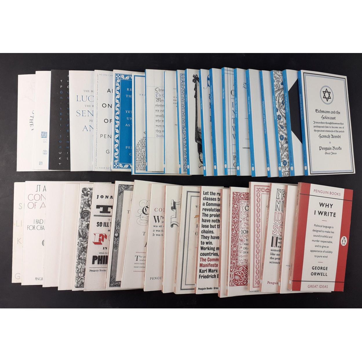 Easy access to world-changing, influential and inspirational thought across the centuries with these first edition PENGUIN GREAT IDEAS texts to include 18 volumes of series one red spine titles and 20 blue spine volumes of series 2 titles. Authors include Confucius, Plato, Francis Bacon, Kierkegaard, Machiavelli, Karl Marx, Mary Wollstonecraft, Darwin, Ruskin, George Orwell and many others. Generally excellent condition, one or 2 have coffee stains to covers.