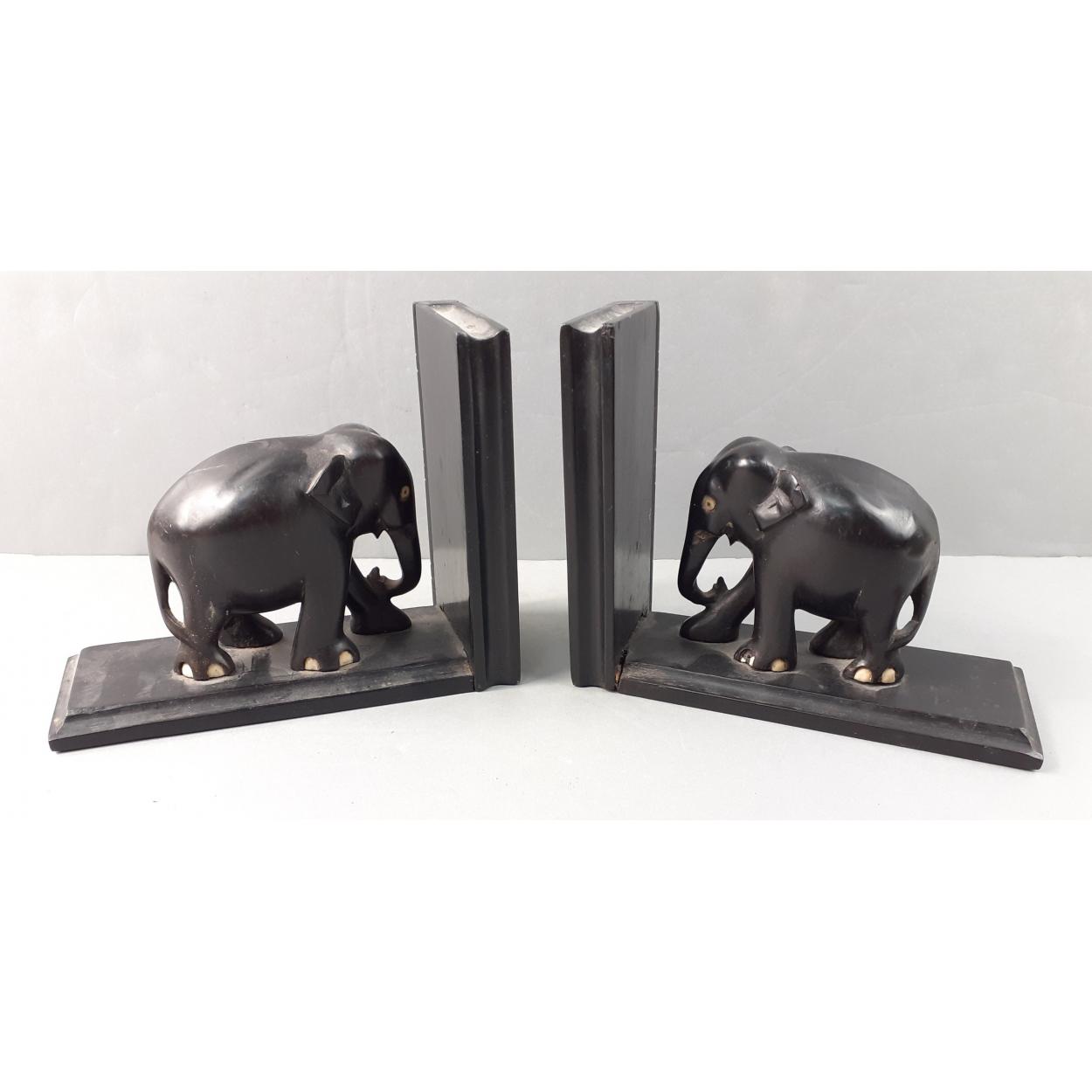 A lovely pair of hardwood bookends with elephants each 15cm across. One needs tightening