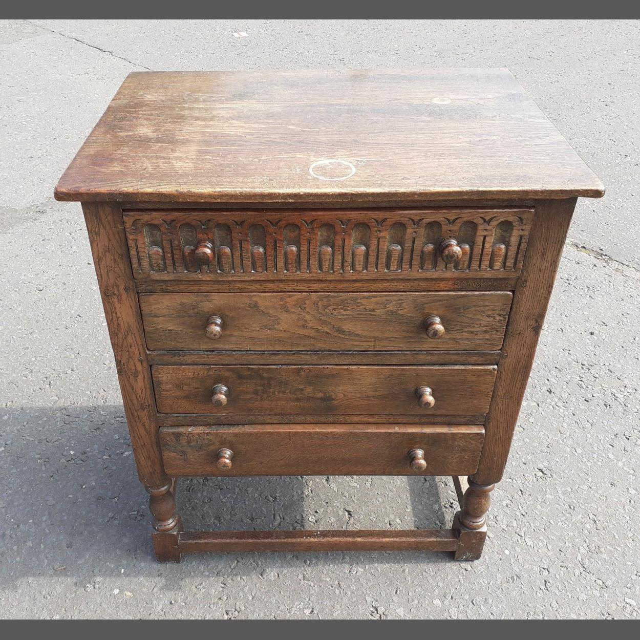 A four drawer oak chest of drawers. The top drawer is carved with arch shapes. D45xW64x75cm approx