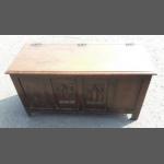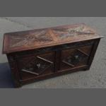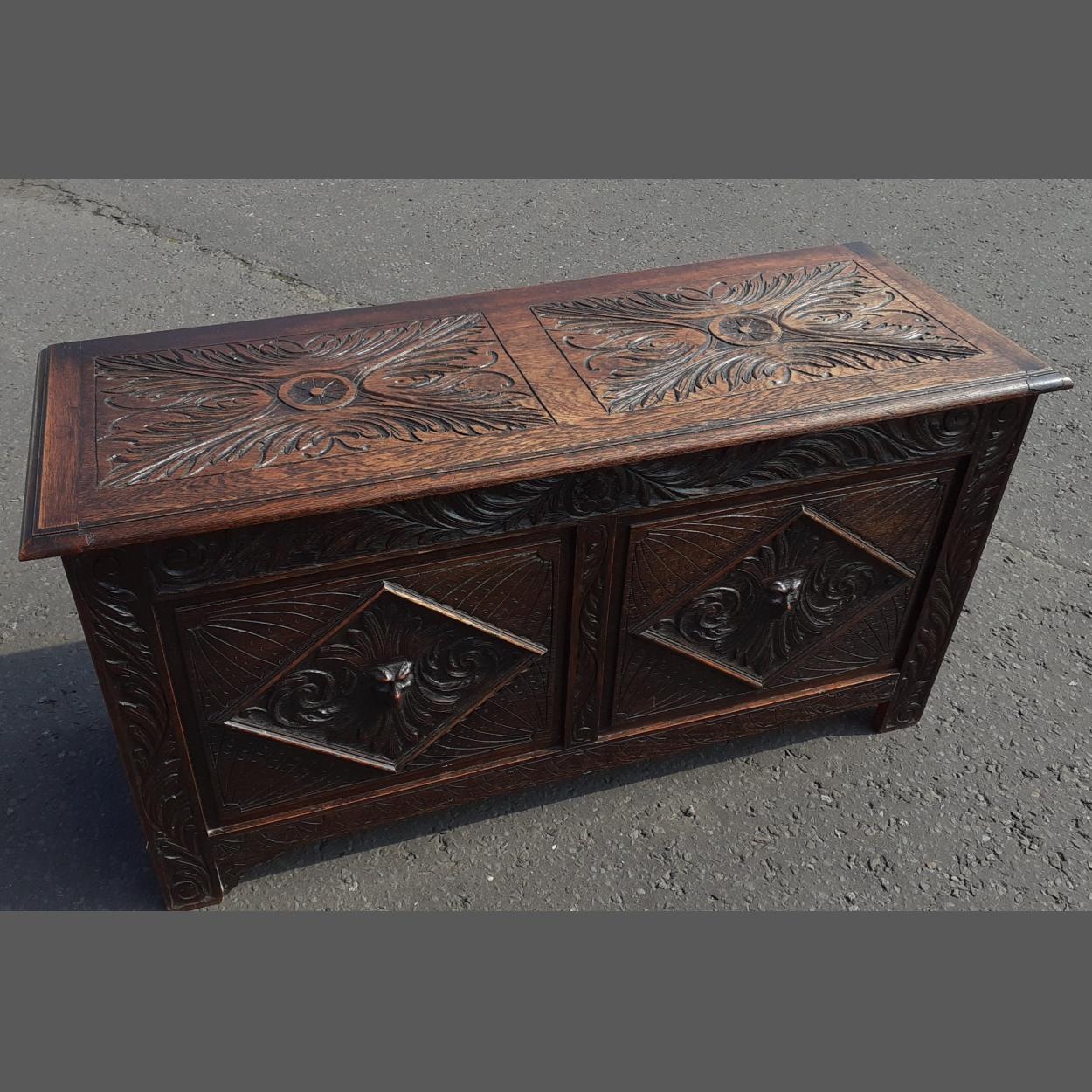 A wooden chest with carved images of the Green Man. Measures W119xD44xH65cm approx