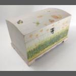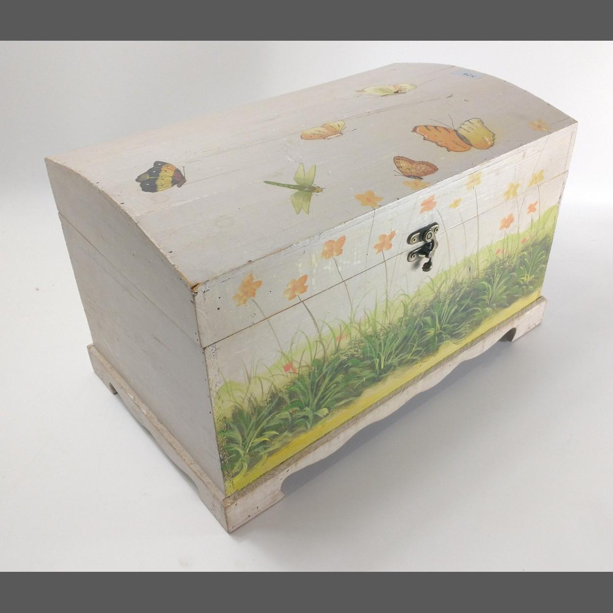 A pretty painted storage box with butterflies and damsel flies on the lid and a pond scene on the front, dome topped it measures H31xW41xD30cm approx