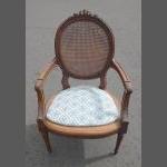 A bergere hand-carved splay backed chair, a couple of small holes in the bergere but generally good condition. 95cm height, 40cm to the seat