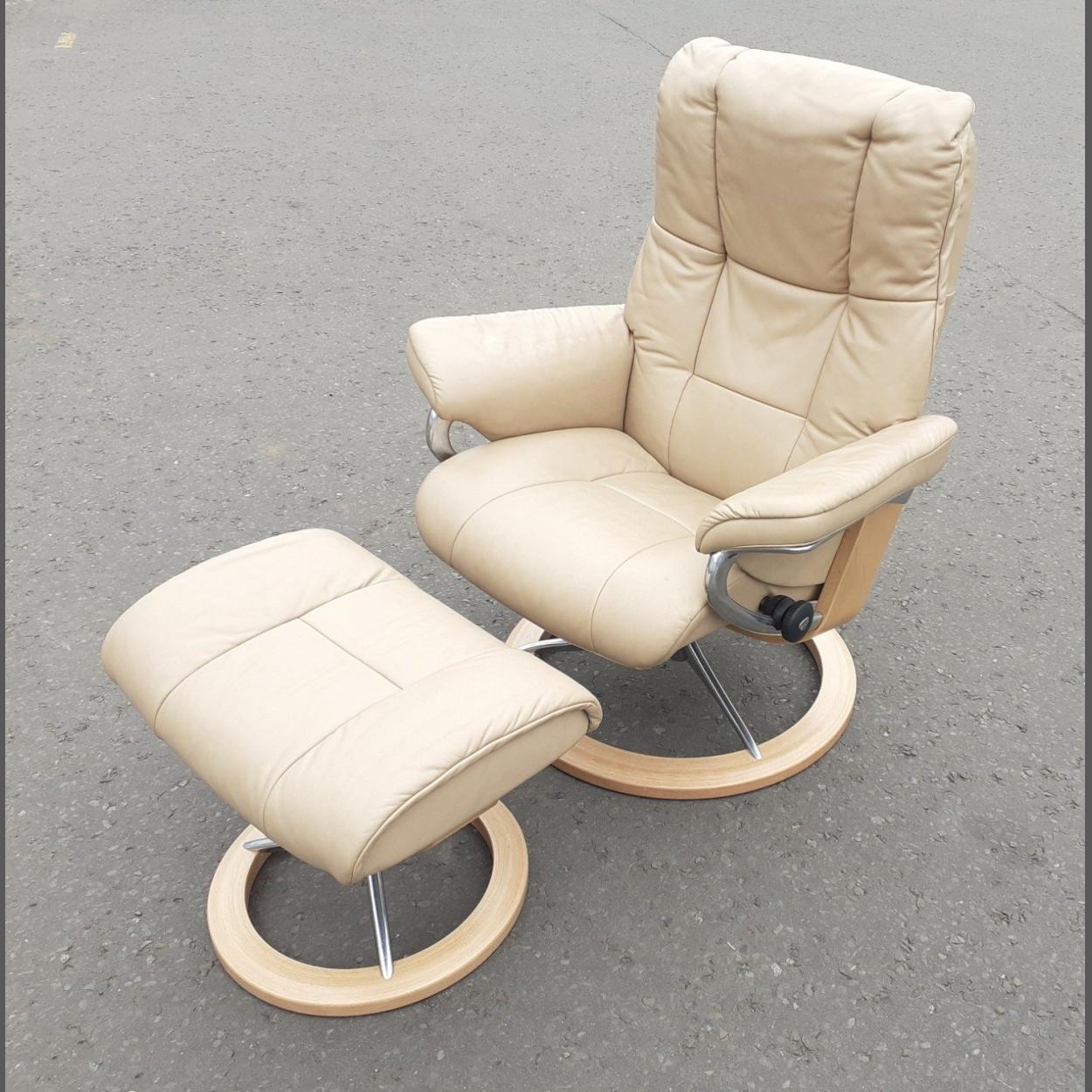 A EKORNES stressless leather armchair and footstool with stainless steel and light ash finishes. This chair is less than 2 years old and cost £1500 rrp
