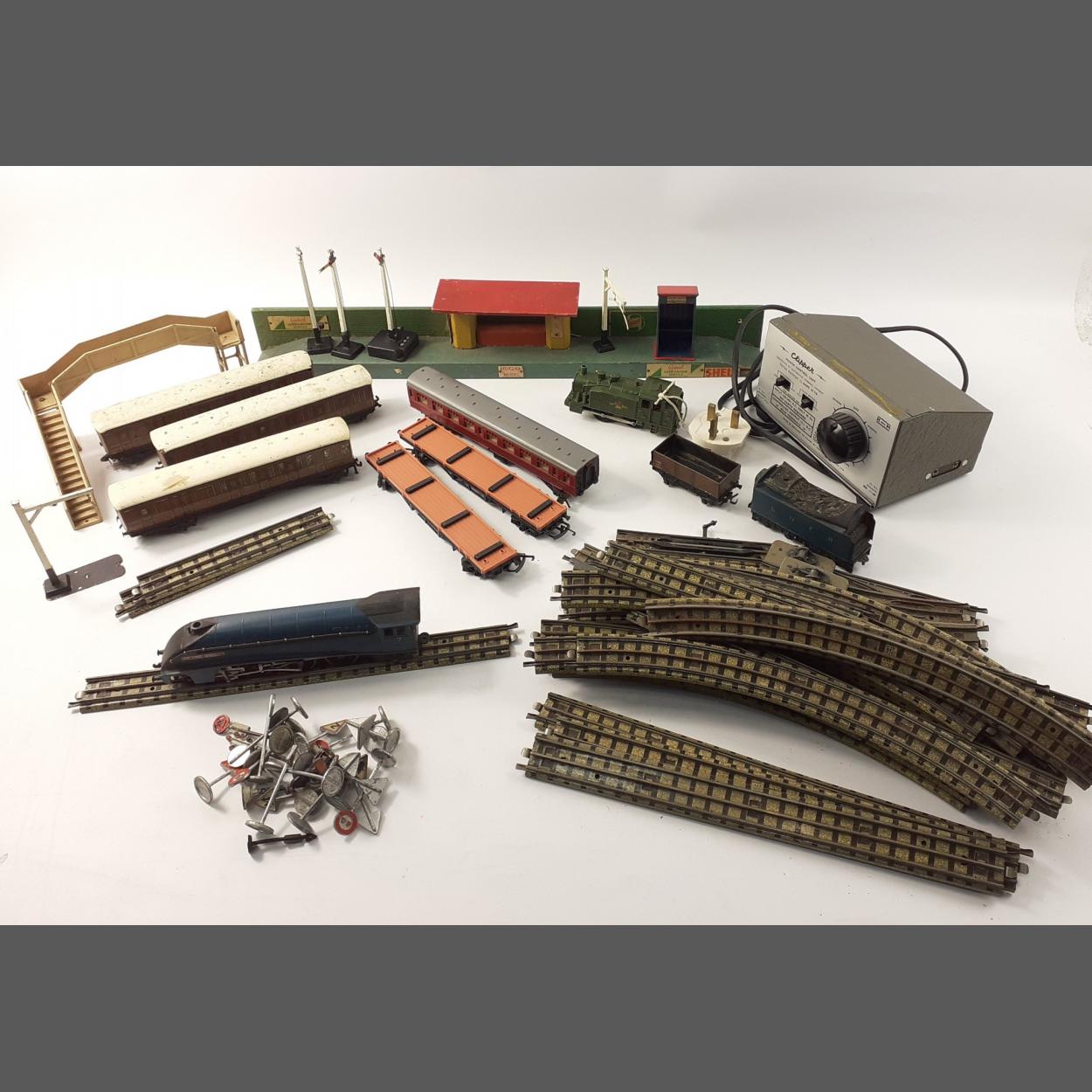 A HORNBY DUBLO train set to include a Sir Nigel Gresley loco, 7 carriages, a power pack, and an assortment of train layout. Well run condition.