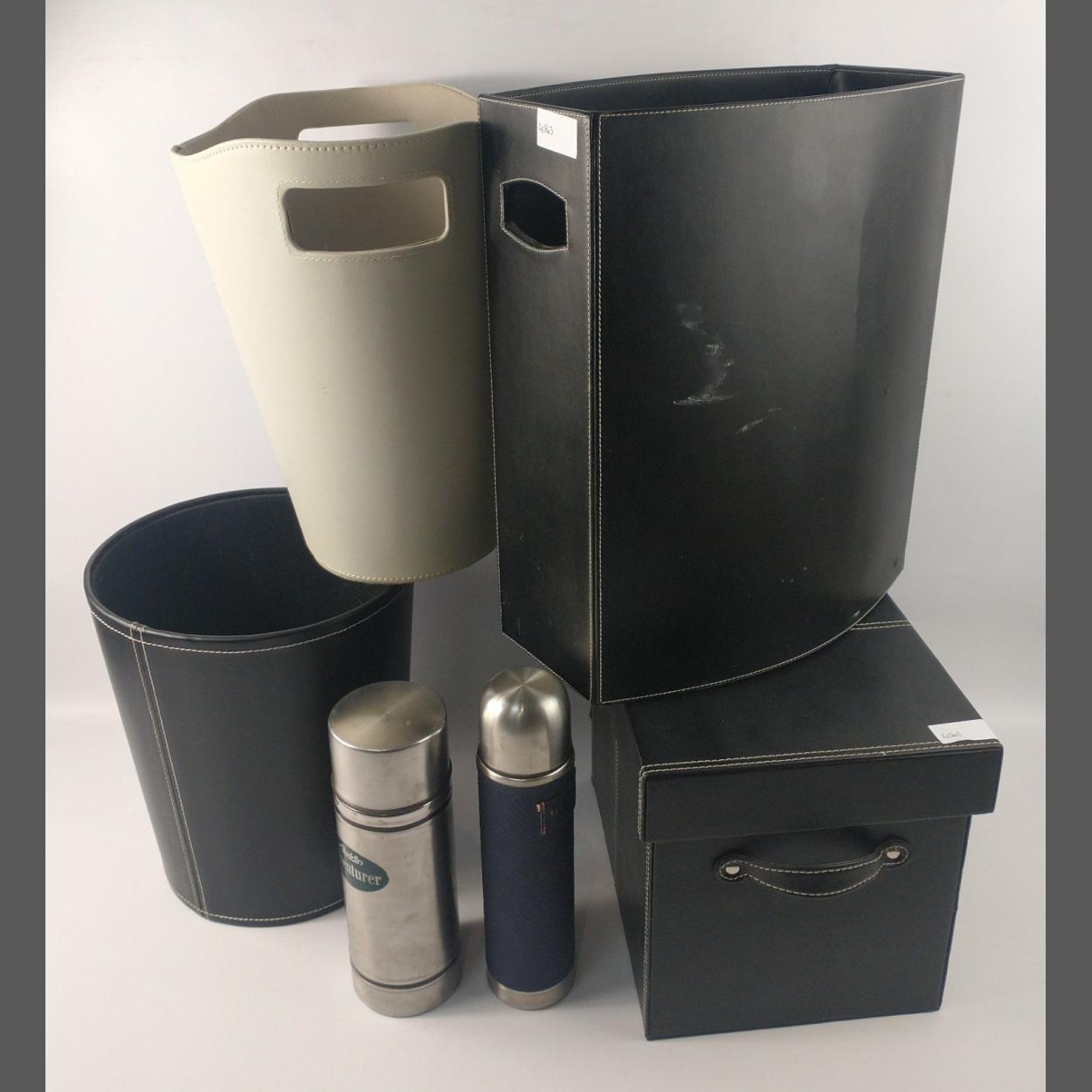 A super useful lot of quality storage boxes to include 40cm open waste bin, a padded lidded box, 2 round waste baskets and 2 flasks,