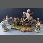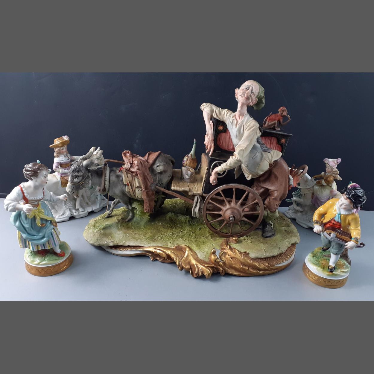 A very large Capodimonte-esque organ grinder with minor damage at a few extremities, a pair of German fairings style spill vases, and 2 other figures