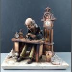 A charming figurine of an old watchmaker with cat by CAPODIMONTE, modelled by CORLESE, number 357 clock stands 25cm high, figure 23cm across approx