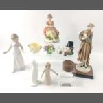 A mixed ceramic lot to include Florence original Guiseppe Armani figurine - Young Lady with Yorkshire Terrier, an Italian lady with spaniel, a Nao young girl (with damaged fingers and candle), a Belleek cauldron (green stamp), and others