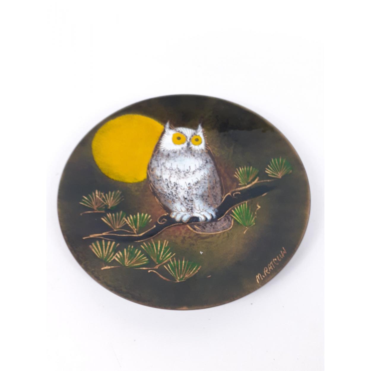 An enamelled design of an owl with gilt highlights on a copper base by MARGARET RATCLIFF, 22cm dia.