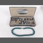 A white metal jewellery box 23x9x5cm with contents of costume jewellery and a ring set with clear stones stamped silver, Size K, gross weight 2.5g