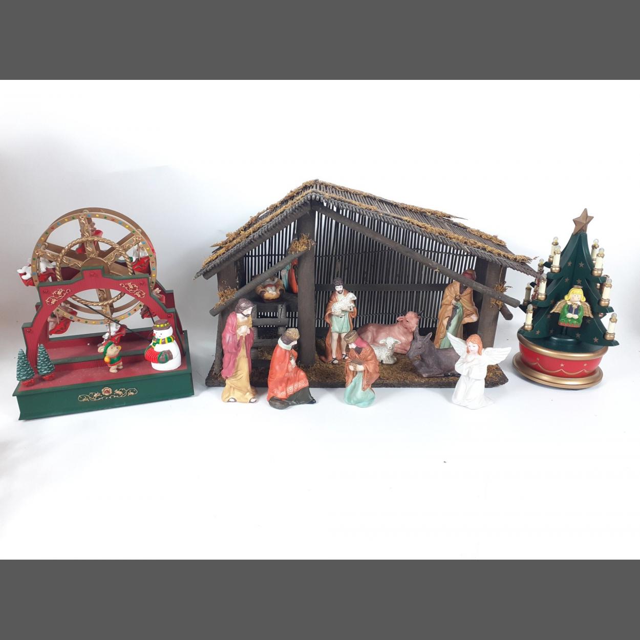 Beat the Christmas rush - a wooden nativity scene 40x25cm approx with all the appropriate figures plus from AVON COSMETICS - a musical Angel Christmas Tree, a Musical Ferris Wheel and a Frosty Folks Band