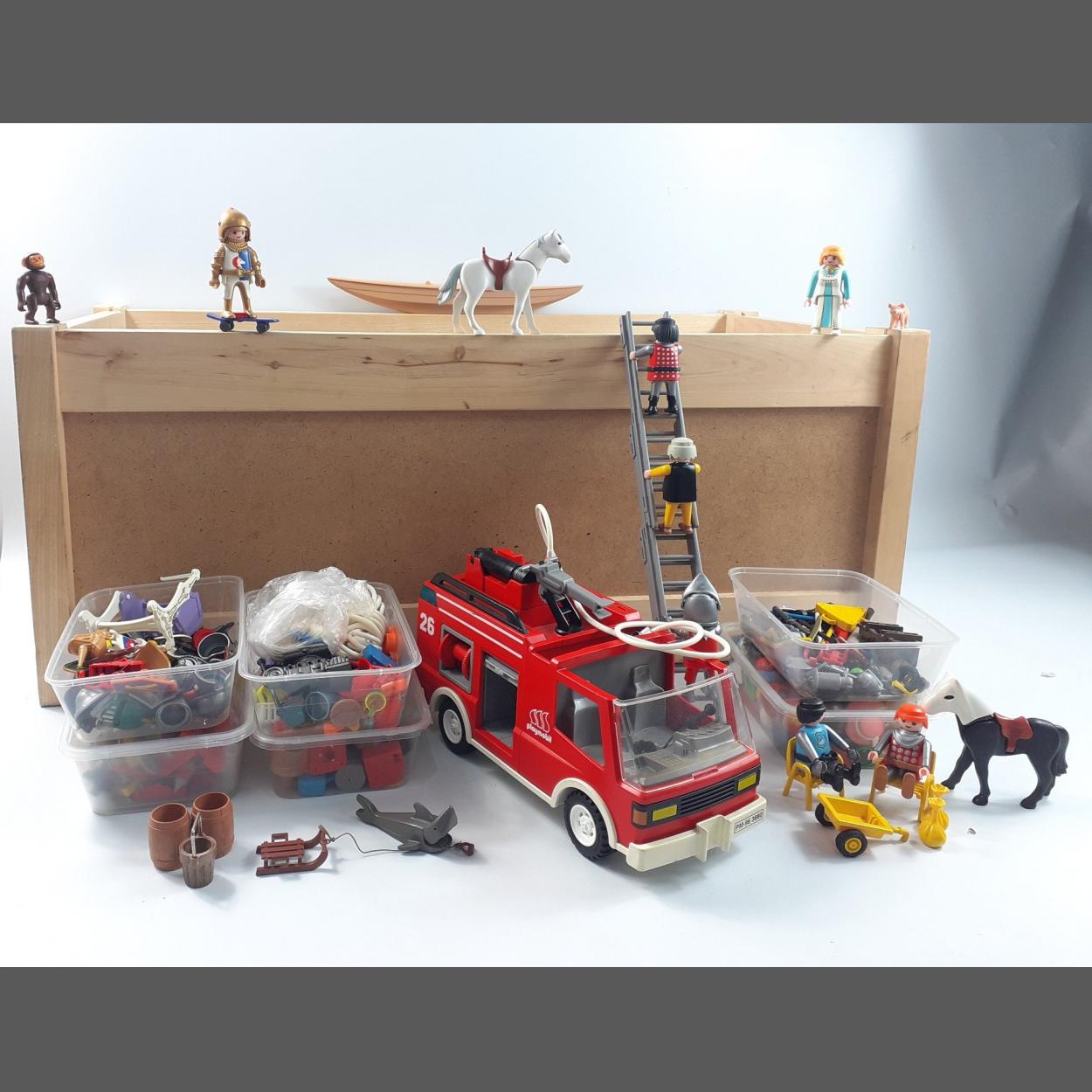 A wooden toy chest 70x36x30cm approx full of all the wee Playmobil bits that usually get lost or eaten by the dog including a PLAYMOBIL fire engine, a plastic box full of various headgear, a box with a wide selection of killing implements including knives, spears, rifles etc, lots of different characters, a trebuchet, scenery and a whole lot more