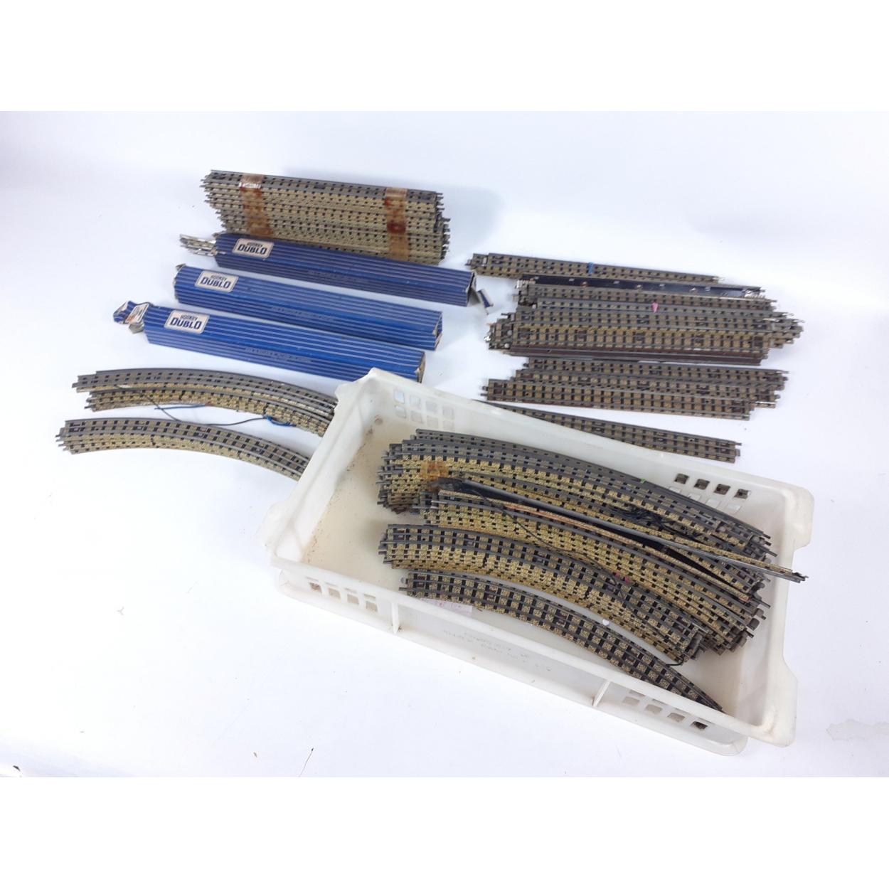 A large quantity of HORNBY-DUBLO track to include curved tracks approx 30 and 34cm long and straight tracks approx 30cm long all contained within a useful plastic box