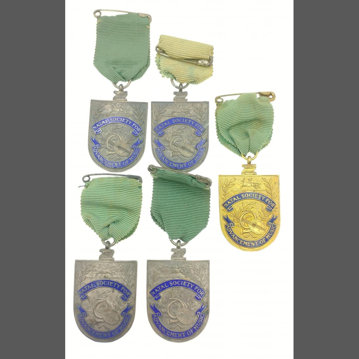 A 9ct stamped gold medal from the Natal Society for Advancement of Music gross weight 8.00g, plus four 925 stamped medals also from the Natal Society for Advancement of Music gross weight 48.50g