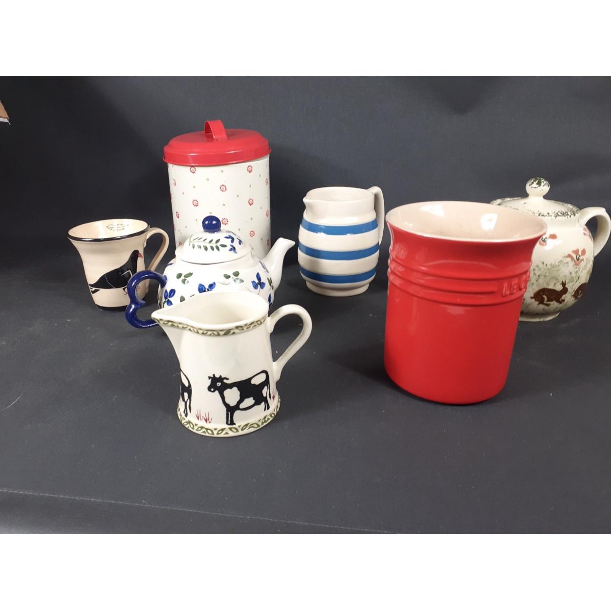 A large collection of kitchen ware to include a Le Creuset utensil jar, PRICE KENSINGTON teapot plus a CORNISH WARE jug and others