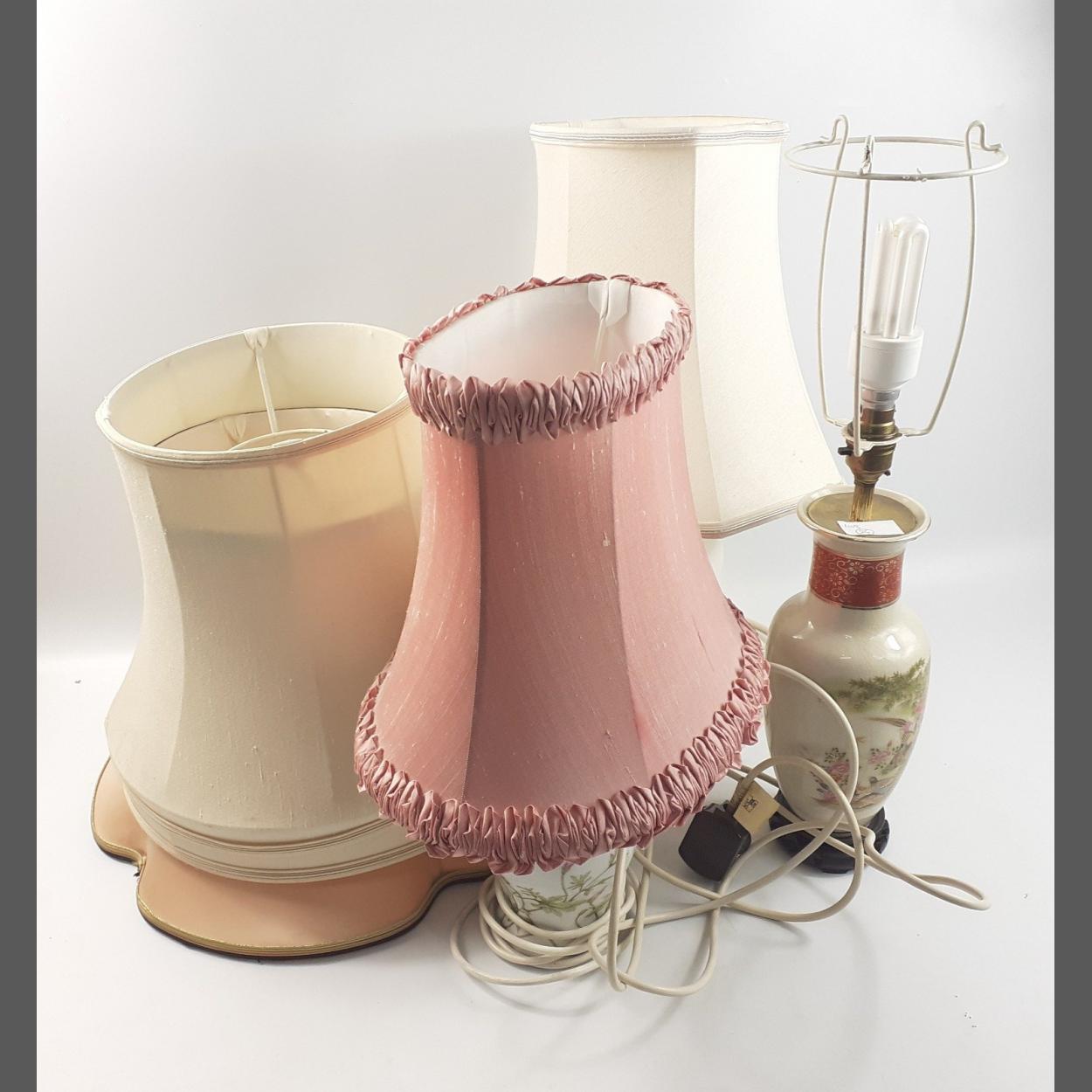A LARGE collection of lampshades and lamps to include an Oriental vase converted into a lamp complete with wooden carved stand, 54cm tall approx, a metal column lamp, 36cm tall approx and a W.S. Grandison poster, 36.2cm talland 29cm wide. All in good/fair condition.