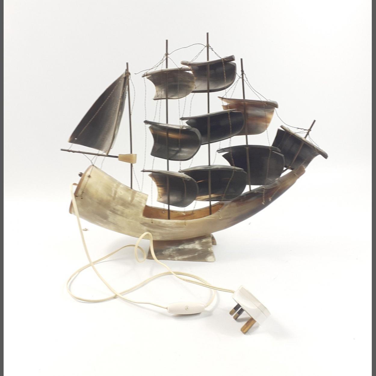 A DIFFERENT, UNIQUE ITEM! A fabulous rams horn which has been made into a ship lamp, complete with plug and on mount. Great craftmanship throughout! Dimensions - 35.7cm long and 36cm tall. Condition - good condition.