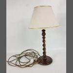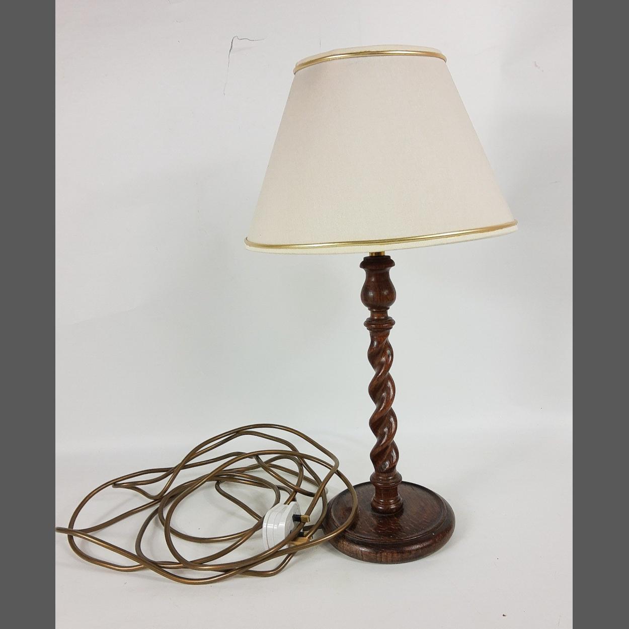 A vintage DECORATIVE WOODEN SPIRAL lamp with shade and plug. Dimensions 49cm high. Good condition