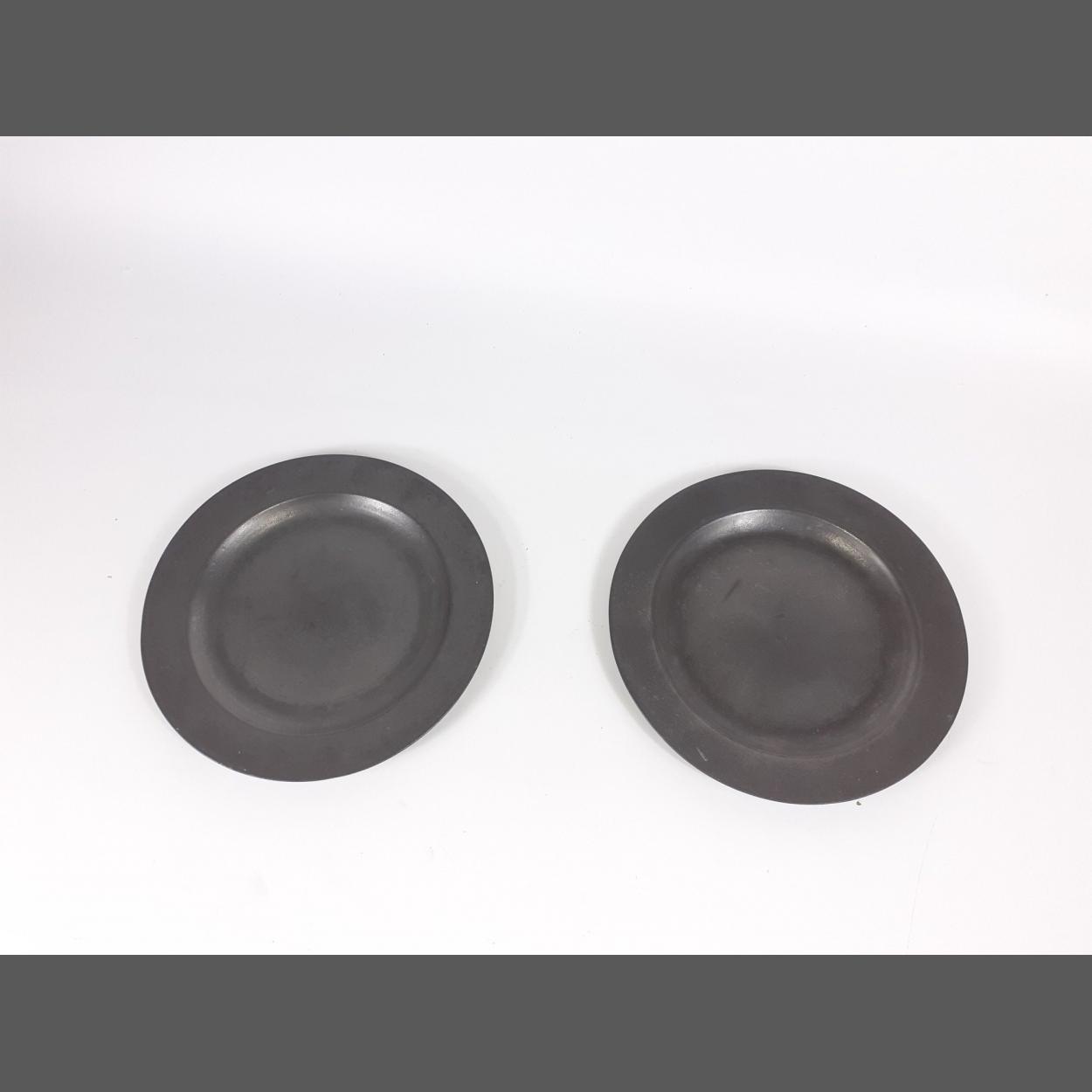 Two vintage pewter plates stamped 'MR' on base, each 23.5cm dia