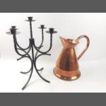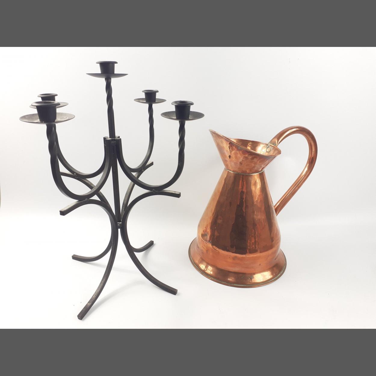 A large copper jug standing 30cm tall and a 5 branch metal candle holder 42cm tall