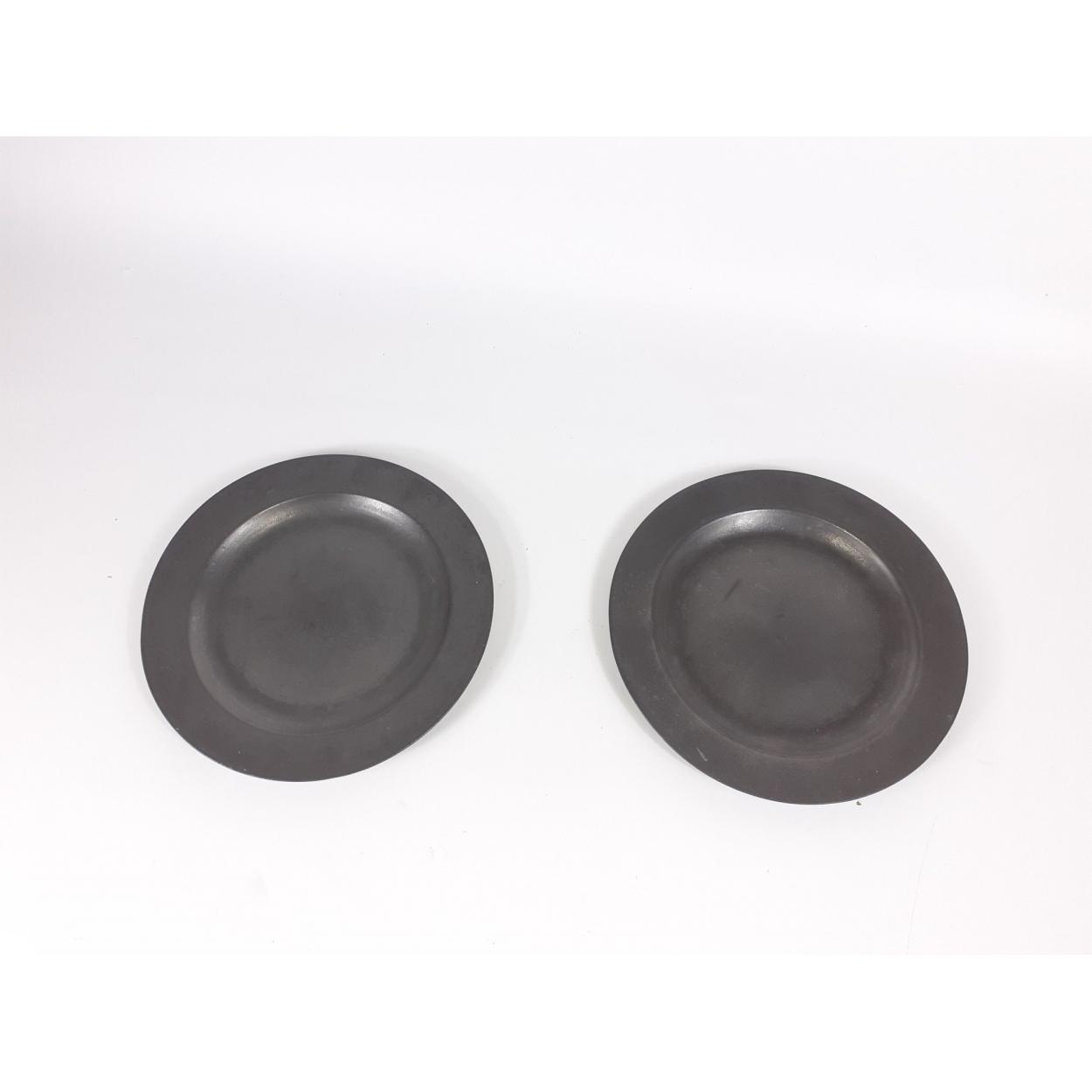 Two vintage pewter plates stamped 'MR' on base, each 23.5cm dia