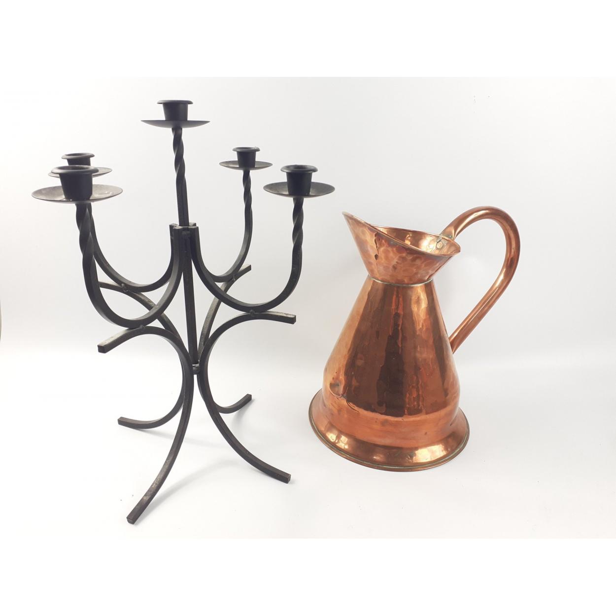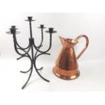 A large copper jug standing 30cm tall and a 5 branch metal candle holder 42cm tall