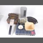 A QUALITY mixed lot to include an antique MACFARLANE biscuit tin, a fan (in working order), a letter box draught cover, a hand-painted kidney shaped jewellery dish, a Power Fix organiser box, a ceramic vase, an Ironbridge museum tile and a small fish steamer