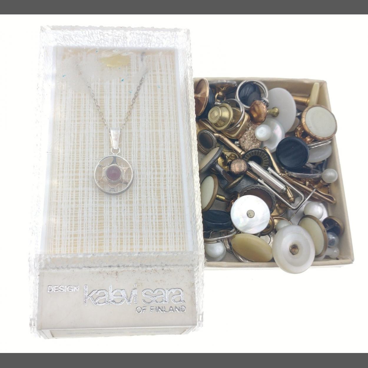 A boxed FINNISH KALEVA SARA Sterling Silver pendant with centred red stone still in its presentation case with a box FULL of some vintage yellow and white metal cufflinks etc
