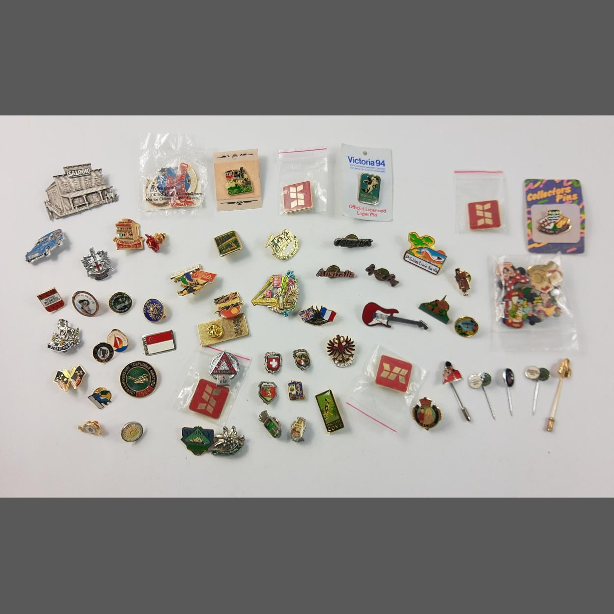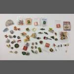 A plastic tub full to include lots of collector lapel badges from all over the world