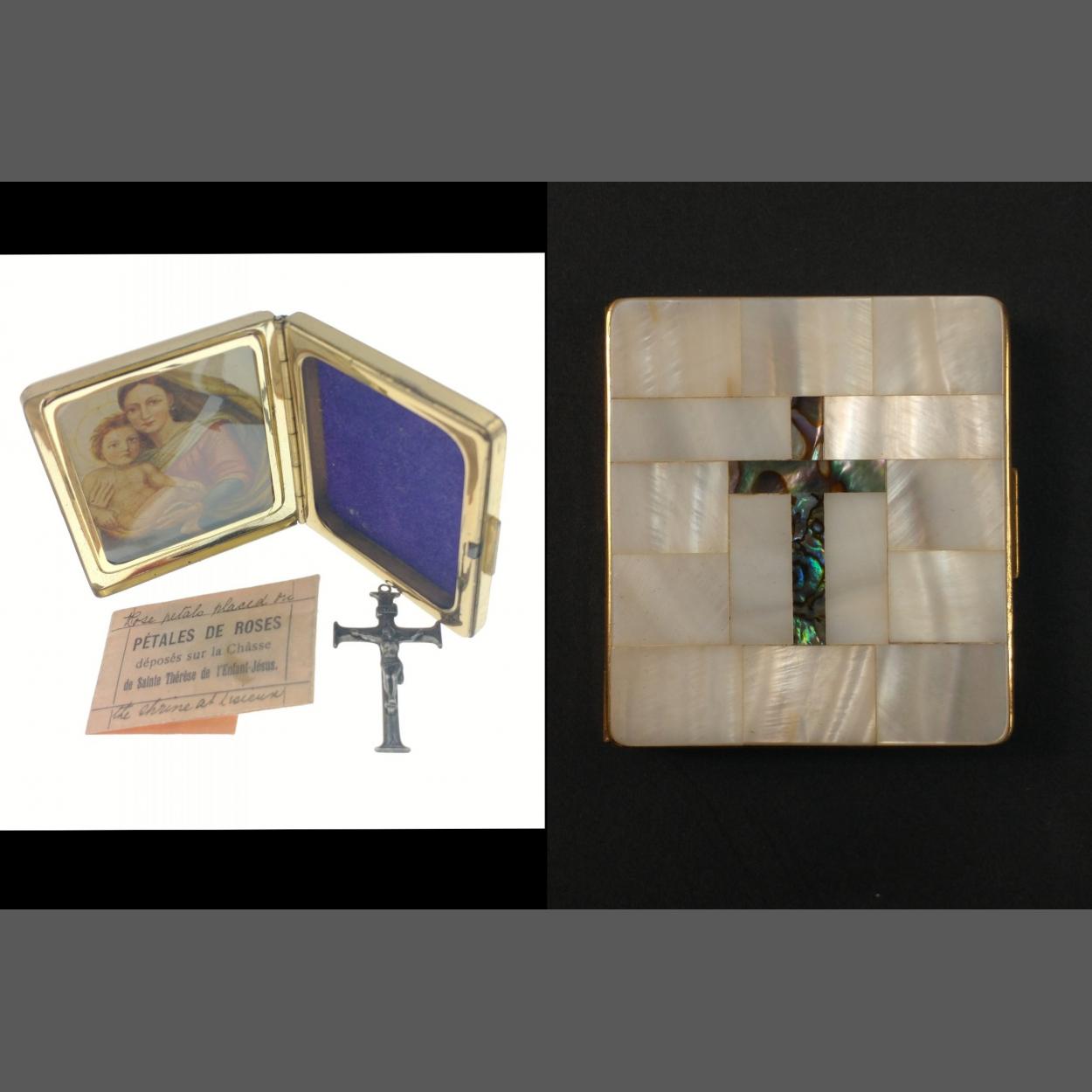A nice quality yellow metal snap-shut keepsake box with a cross and mother of pearl inlay dimensions 5cm x 6cm with a Rose Petal from Carmelite Monastery at Lisieux WITH a SILVER stamped crucifix INRI weight 3.30g approx