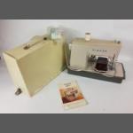 An electric Singer sewing machine with. Dimensions - 40.5cm long at base. 27.8cm high. Good condition