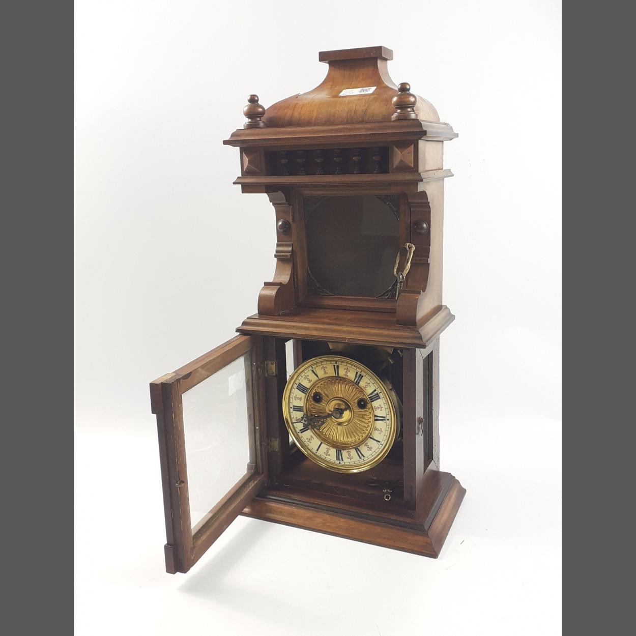 A FABULOUS wooden mantle clock , complete with key. Dimensions - 49.2cm tall, 28.1cm long. Condition - A couple of the wooden pieces on the top are missing as well as another top of the wooden piecese has broken off. Two of the circle pieces have also broken off from the front of the clock. Still a fantastic clock!