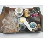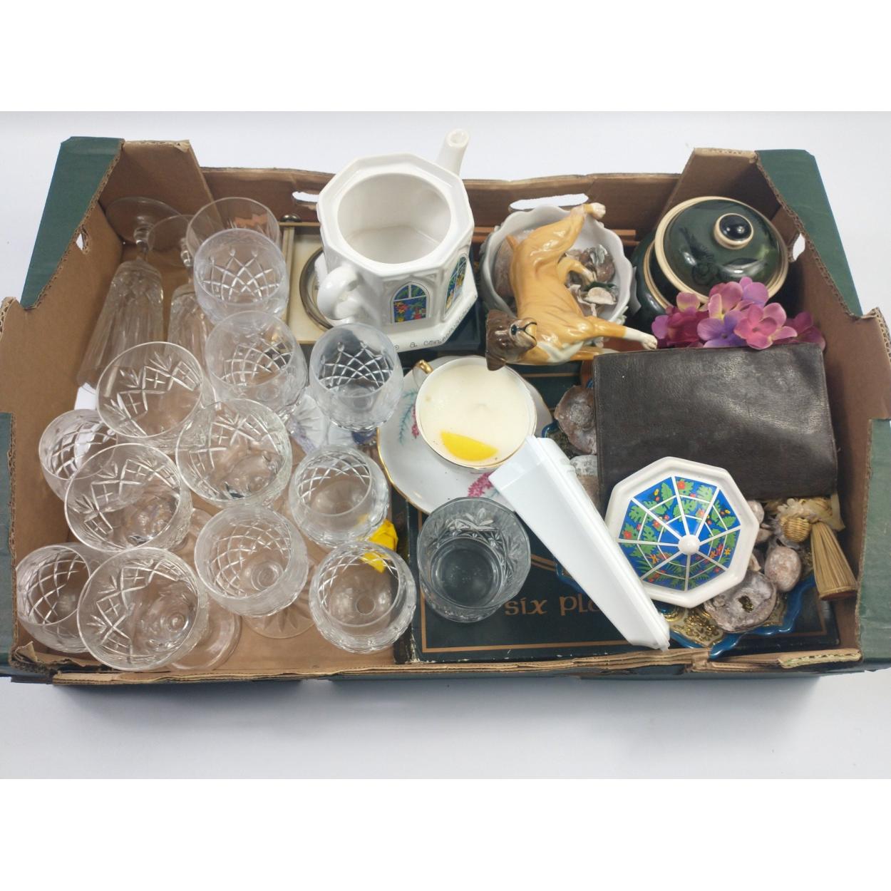 A box of assorted glassware and household objects which includes 14 crystal glasses, place mat set depicting castles and much more
