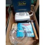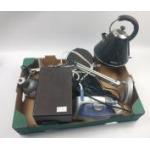 A mixed lot to include an angle-poise desklamp 50cm height approx in silver, A BREVILLE electric steam iron and a small brown storage box 25cm x 15cm x 16cm etc etc