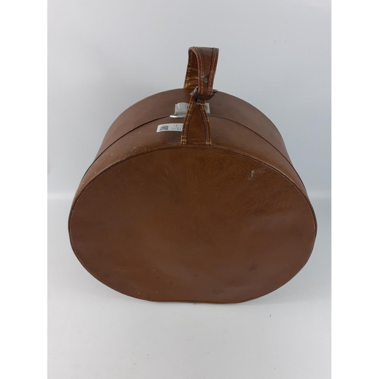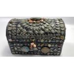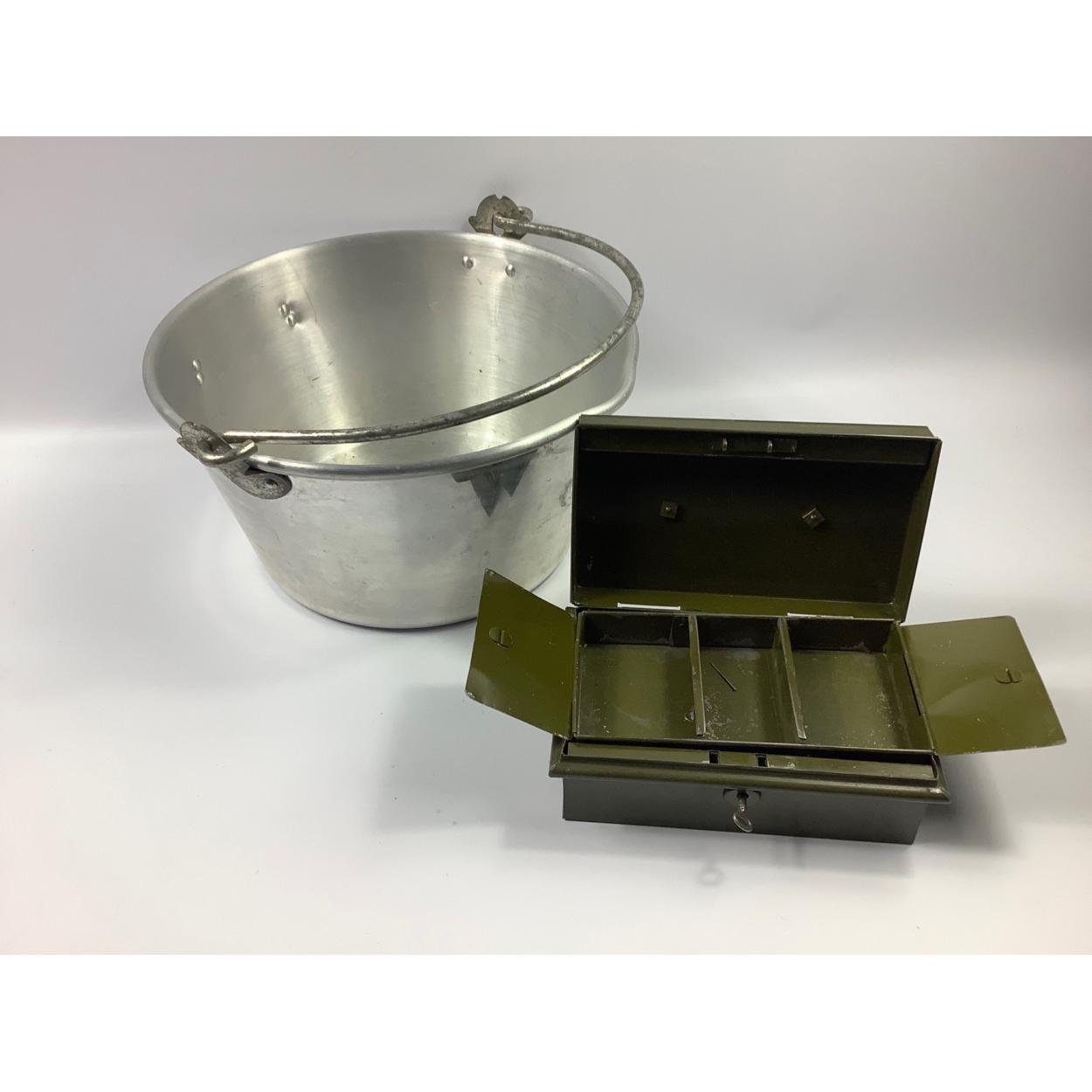 A lightweight aluminium jelly pan, dia approx 33cm, stands approx 17cm high plus a metal money box in khaki green top section (with 2 lidded and 1 open compartment) lifts out. Retains original key