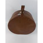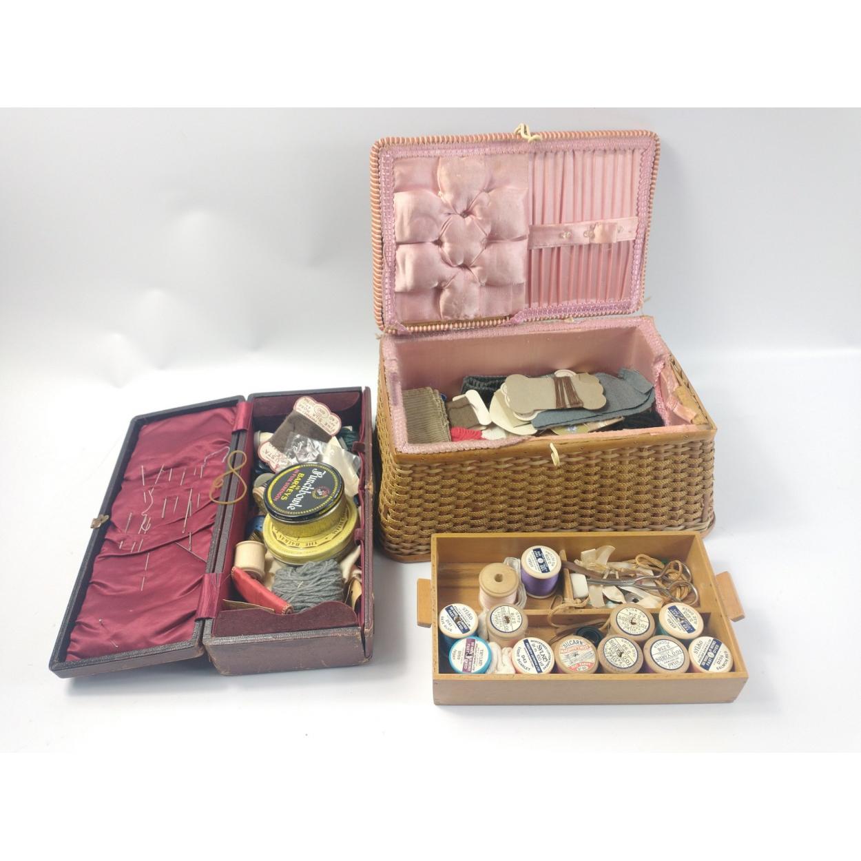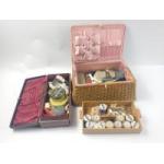 An attractive vintage small wicker basket on feet. Measures 37 x 31 x 31 cm approx. With intact leather fastener to lid, Basket contains three wall antique mounted plates from Copeland Spode, one with blue and white oriental scene and one with an etruscan type scene