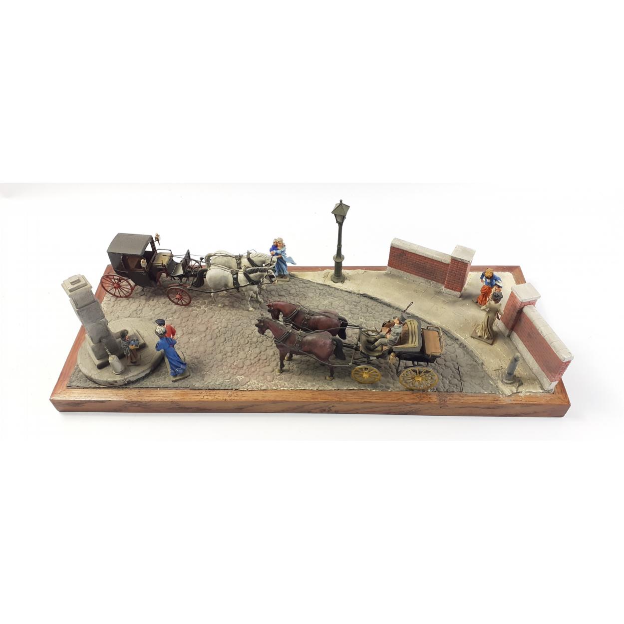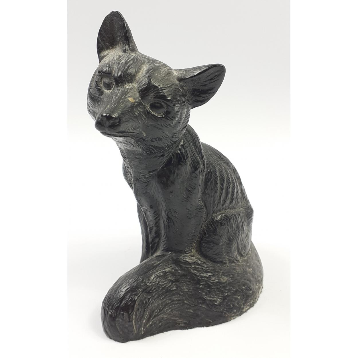 A group of four cat figures in various media including a curled up wooden cat (10cm high), a North Light Wade resin Siamese cat (17cm), a terracotta green kitten with ball (16cm), and a Devon Ceramics marmalade cat with his head hanging over the shelf