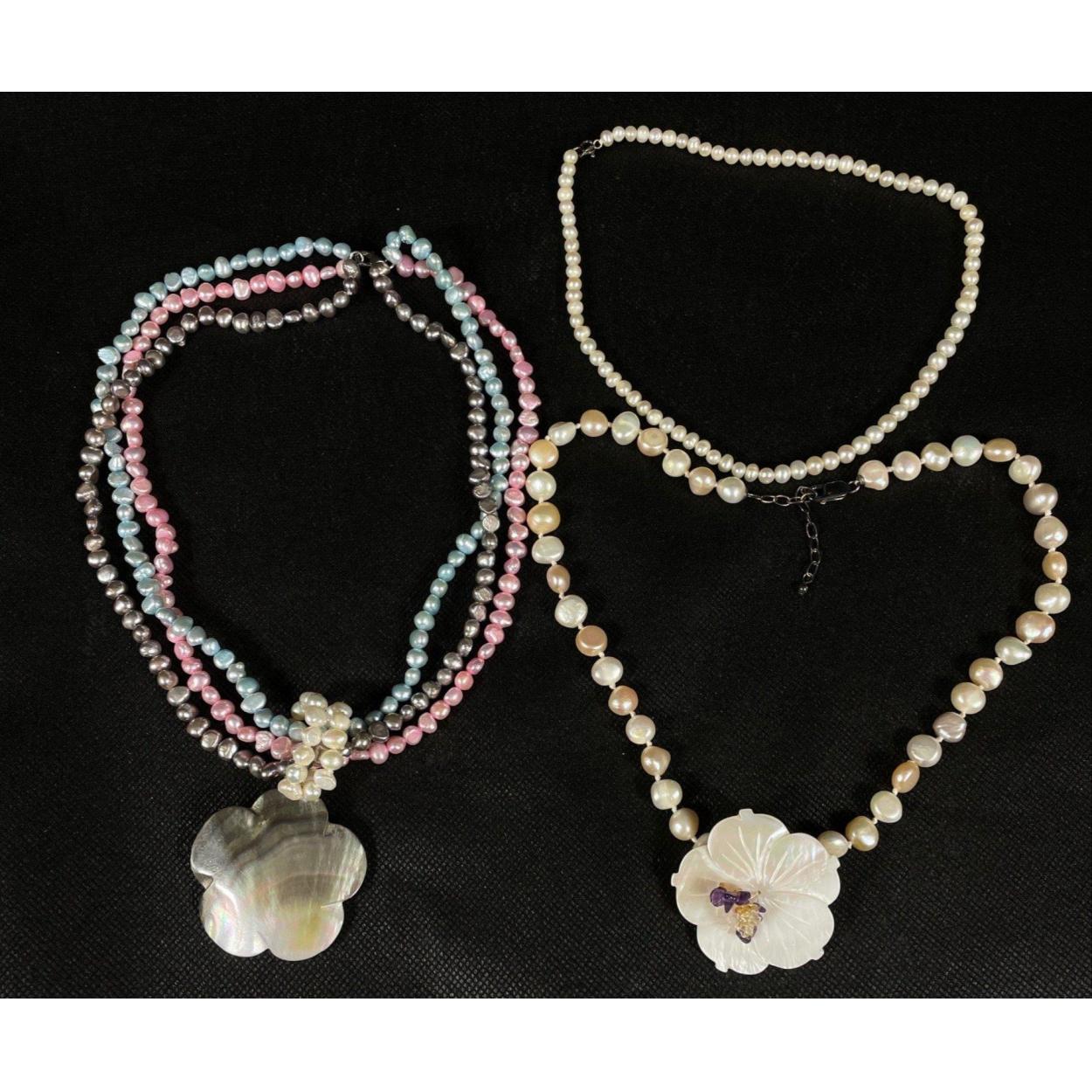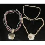 A selection of PEARL NECKLACES to include 3 string multi-coloured with an abalone flower pendant, a single string with a flower pendant and a 15cm single string