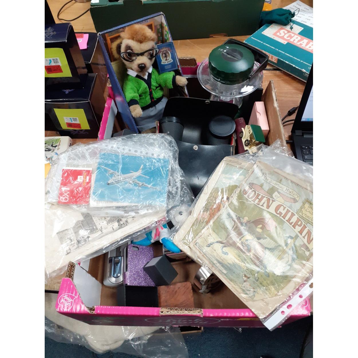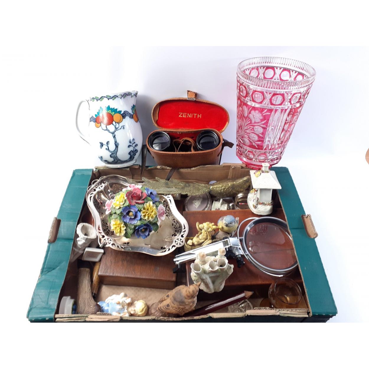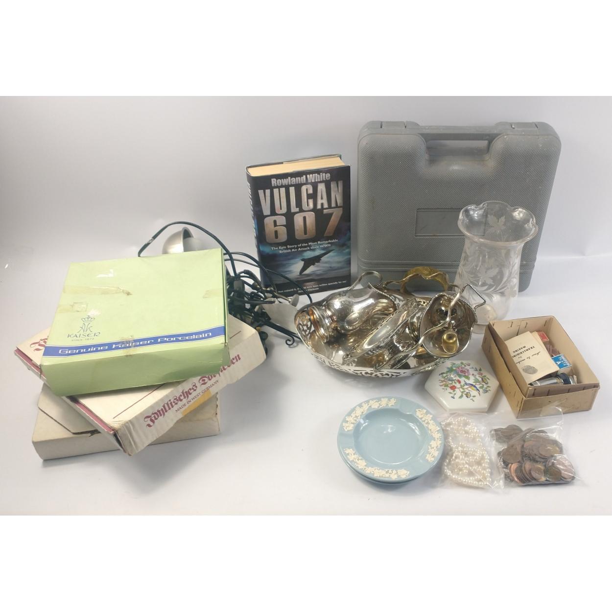 A wondrous box of all sorts to include a double string of faux pearls approx 40cm long, a heavyweight gold-coloured chunky bangle (dia approx 7.5cm), a small bag of old copper coins dating from George V onwards, a cut-glass candle holder standing 20cm high with a sterling silver collar (Birmingham 1978), a small collection of EPNS including a sugar scoop, jug (15cm tall), a small taza with pierced edge (16cm dia), a transcribing-slide making kit, 2 Wedgwood ashtrays (15cm dia), a Performance 13mm hammer drill in case, 3 decorative wall plates to include 'The Landing', 'The Blacksmith', and 'The Mocking Bird' , a small lamp for attaching to a table edge,