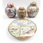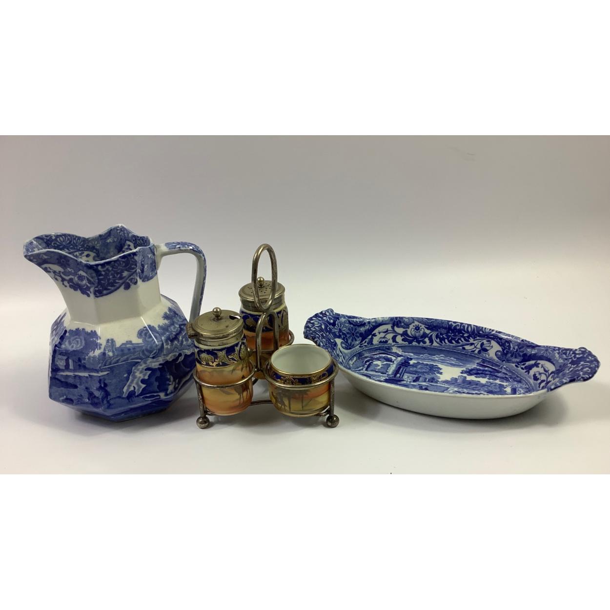 A small COPELAND SPODE gratin dish (21cm long approx), and a many-sided jug (13cm tall approx) plus a NORITAKE cruet set with EPNS collars decorated with a desert scene