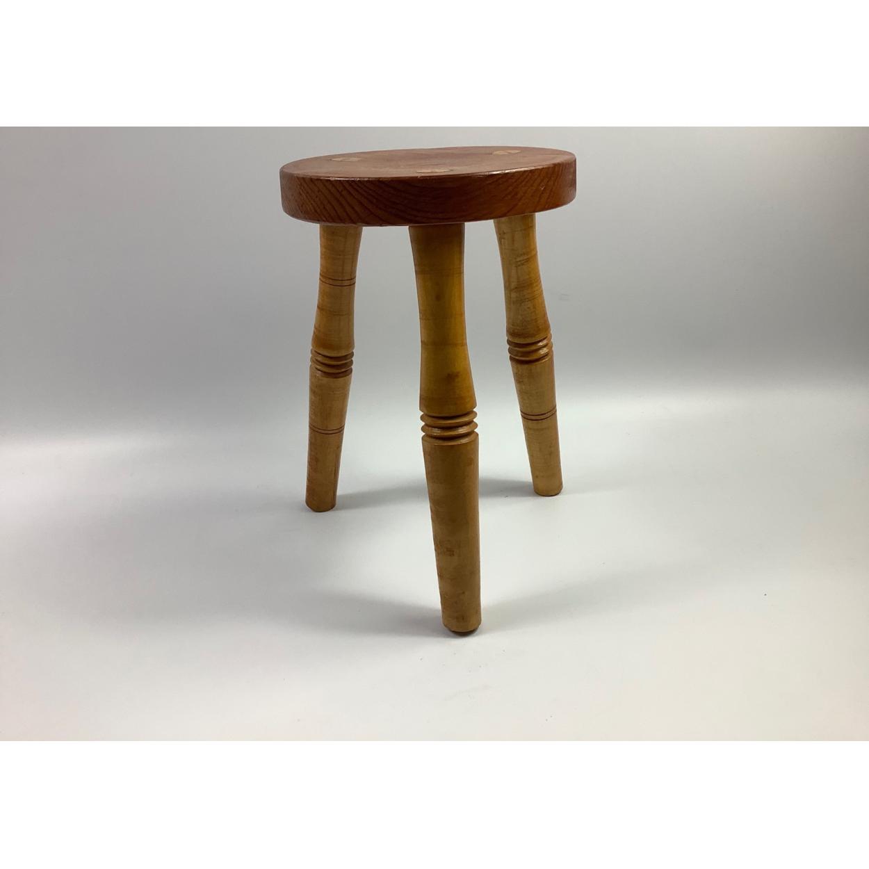 A small three-legged stool in pine seat is 19cm dia, height 29cm
