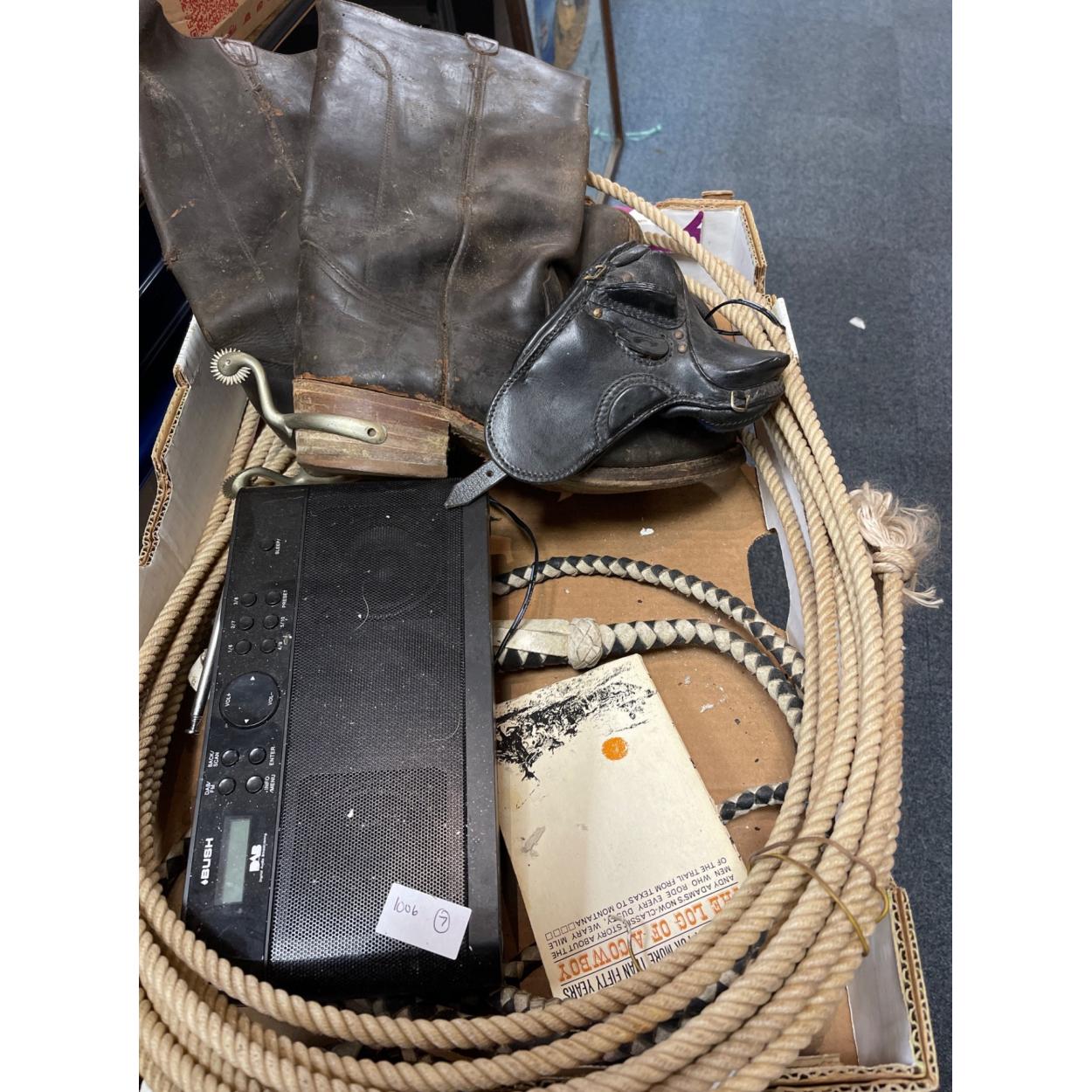 A mixed box of EQUINE INTEREST items to include a pair of rugged cowboy boots American size 10.5 with spurs, a real LASOO and a whip, with also a miniature realistic leather saddle height 16cm x length 13cm approx and a small BUSH radio!