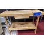 A STURDY proper WORKBENCH COMPLETE with an attached vice, top drawer and lower shelf - dimensions 126cm long x 50cm depth x 85cm height approx