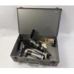 A metal box containing hand tools for use with an air compressor. Includes INGERSOLL-RAND LA411-EU Reversable angle drill, DRAPER 4207 grinder with accessories. An INGERSOLL RAND 116 Air Hammer in cse with bits. In good used condition.