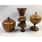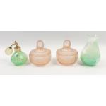 Four pieces of mixed glassware to include a beautiful cranberry apothecary style jar with clear glass base and lid standing 22cm high, a Caithness-style vase (23cm), a clear glass vase (21cm), a specimen vase (21cm high)