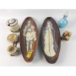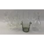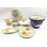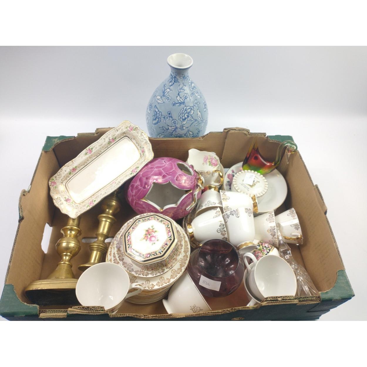 A mixed lot including a WEDGWOOD 'Clio' pin dish (10 cm dia) and small vase (10cm high), an OLD ROYAL tea service consisting of 6 cups, 6 saucers, 6 plates, a milk jug and sugar bowl, a crystal bell (17cm high), a multi-coloured glass swan (14cm tall), a Caithness-style bowl, an unusual glazed Italian flower vase (approx 22cm high), a part Japanese tea service including 4 cups, 6 saucers and 6 plates, 2 brass candlesticks (26cm tall) etc
