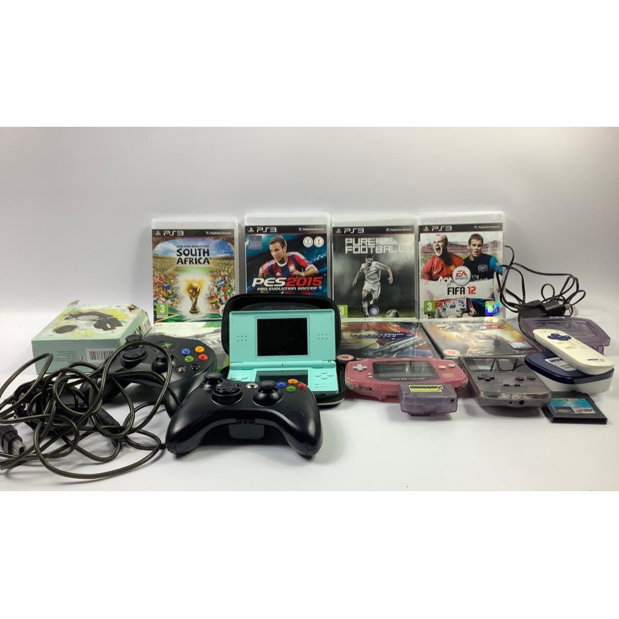 A mixed lot of (untested) 'vintage' electronic games including a NINTENDEO DS Lite in original case, GAME BOY ADVANCE, GAME BOY COLOR, 2 X-BOX controllers, a Now TV box with remote control plus a quantity of PS3 GAMES including W12, FIFA 12, Pure Football, PES 2015, South Africa Fifa World Cup 2010 and 3 X-Box 360 games - Perfect Dark Zero, Sniper Elite, PGR4