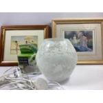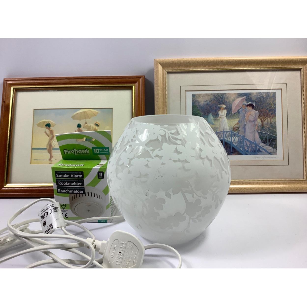 A mixed lot to include a Firehawk 10 year lithium battery smoke alarm, an opaque glass table lamp standing 18cm high and 2 prints, one by Jack Vettriano (frame size 30x25cm approx) and one by Lynn Gertenbach of a 'Country Bridge' (frame size 32x27cm approx)