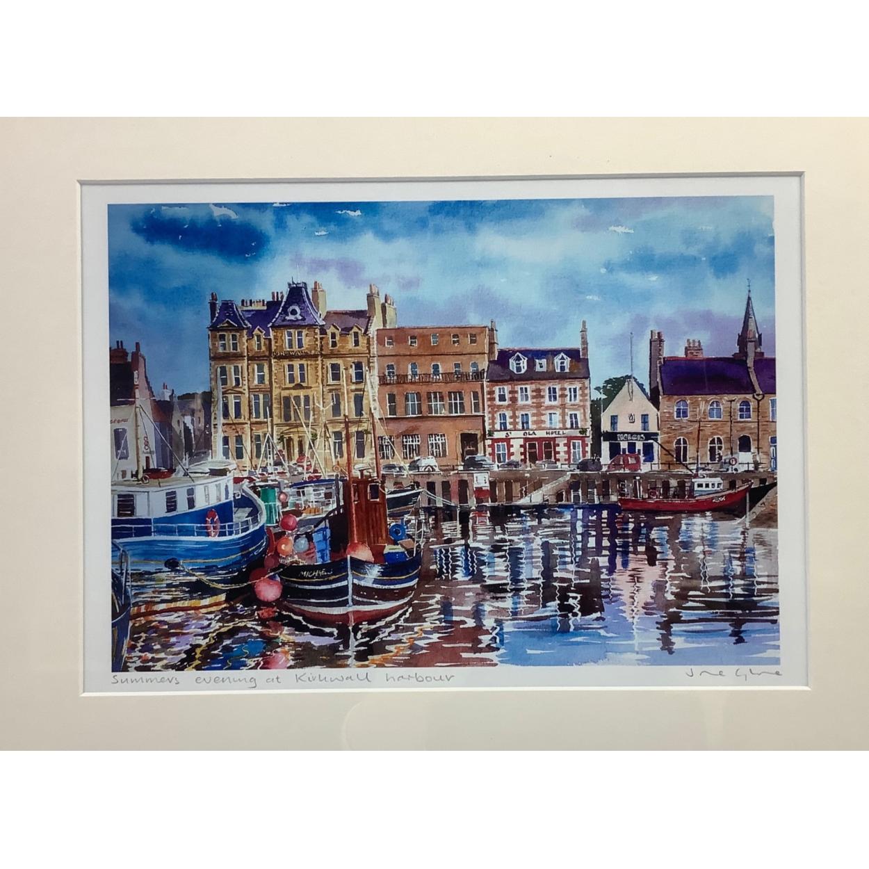 A cheerful colourful framed print of 'Summer's Evening at Kirkwall Harbour' by JUNE GLUE, signed in pencil by the artist, frame size 44x35cm, visible work 25x18cm approx