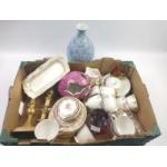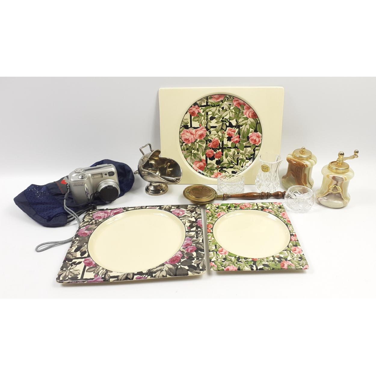 A mixed box to include a NIKON coolpix 885 camera, an onyx pepper grinder and saltcellar (approx 11cm high), various glass items, 3 ROYAL STAFFORDSHIRE serving plates 19x16cm, 23x19cm and 27x21cm, a small white metal sugar scuttle with scoop (approx 11cm high), a mini chestnut roaster in wood and brass (22cm long)
